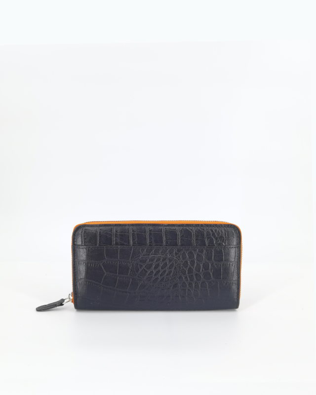 Edle Geldbörse aus hochwertigem Rindleder mit Korokoprägumg; innen: orangefarbenes Lederfutter, mit Reißverschlussfach, drei Hauptfächern sowie beidseitige Karten-/Steckfächer. Ein Extra-Steckfach in der Mitte sorgt nochmals zusätzlich für Stau- und Aufbewahrungsraum für Karten, Zettel, Scheine u.v.m.. Der besondere Clou: die Vortasche mit dem typischen Anne Boenisch-Klappgriff. Der besondere Eye-catcher: der orange-leuchtende Reißverschluss
