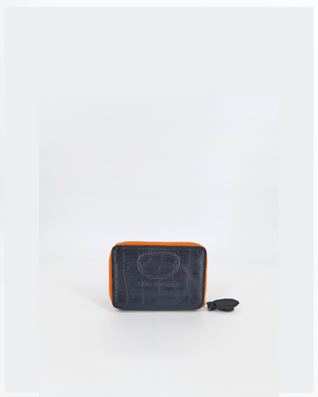 Edle Geldbörse aus hochwertigem Rindleder; innen: orangefarbenes Lederfutter mit 6 Kartenfächern, 2 kleinen Steckfächern und ein längliches Steckfach für Geldscheine. Das Münzfach wird mit einem dezenten Drucknopf geschlossen. Unkompliziertes Handling durch einfaches Aufklappen der Steckelemente im Innern der Geldbörse. Der besondere Clou: die Vortasche mit dem typischen Anne Boenisch-Klappgriff. Der besondere Eye-catcher: der orange-leuchtende Reißverschluss