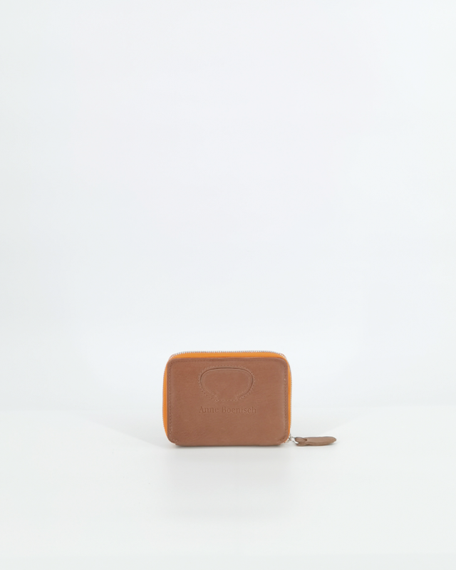 Edle Geldbörse aus hochwertigem Rindleder; innen: orangefarbenes Lederfutter mit 6 Kartenfächern, 2 kleinen Steckfächern und ein längliches Steckfach für Geldscheine. Das Münzfach wird mit einem dezenten Drucknopf geschlossen. Unkompliziertes Handling durch einfaches Aufklappen der Steckelemente im Innern der Geldbörse. Der besondere Clou: die Vortasche mit dem typischen Anne Boenisch-Klappgriff. Der besondere Eye-catcher: der orange-leuchtende Reißverschluss